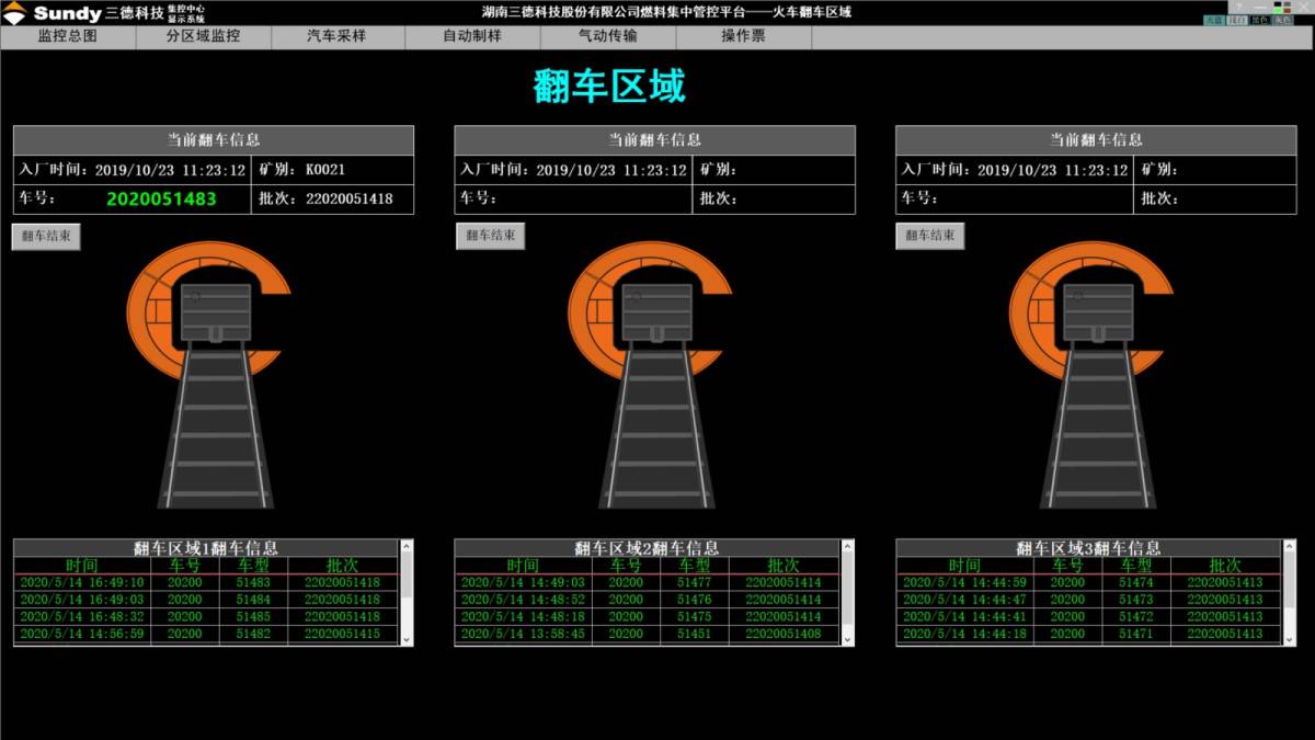 系统具备实时监管的功能,通过对火车入厂、计量、翻车区域的仪器设备的实施监测,实现火车入厂信息录入、火车翻车信息录入,车号识别,翻车信息监控,采样自动管控,流程信息记录,车号信息查询等自动化管控与历史追溯功能。达到火车煤验收监管无人值守,自动化控制,提升验收效率和质量的目标。
